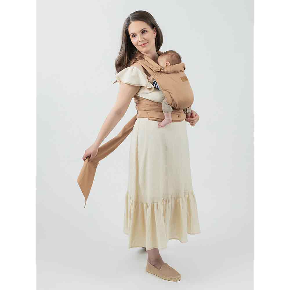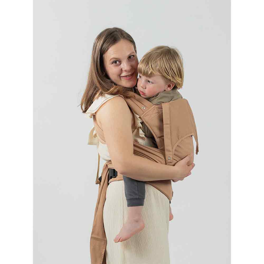 Die Isara Quick Babytrage ist eine Halbschnallentrage und kann schnell und einfach mit einem Schnallenbauchgurt angelegt werden.