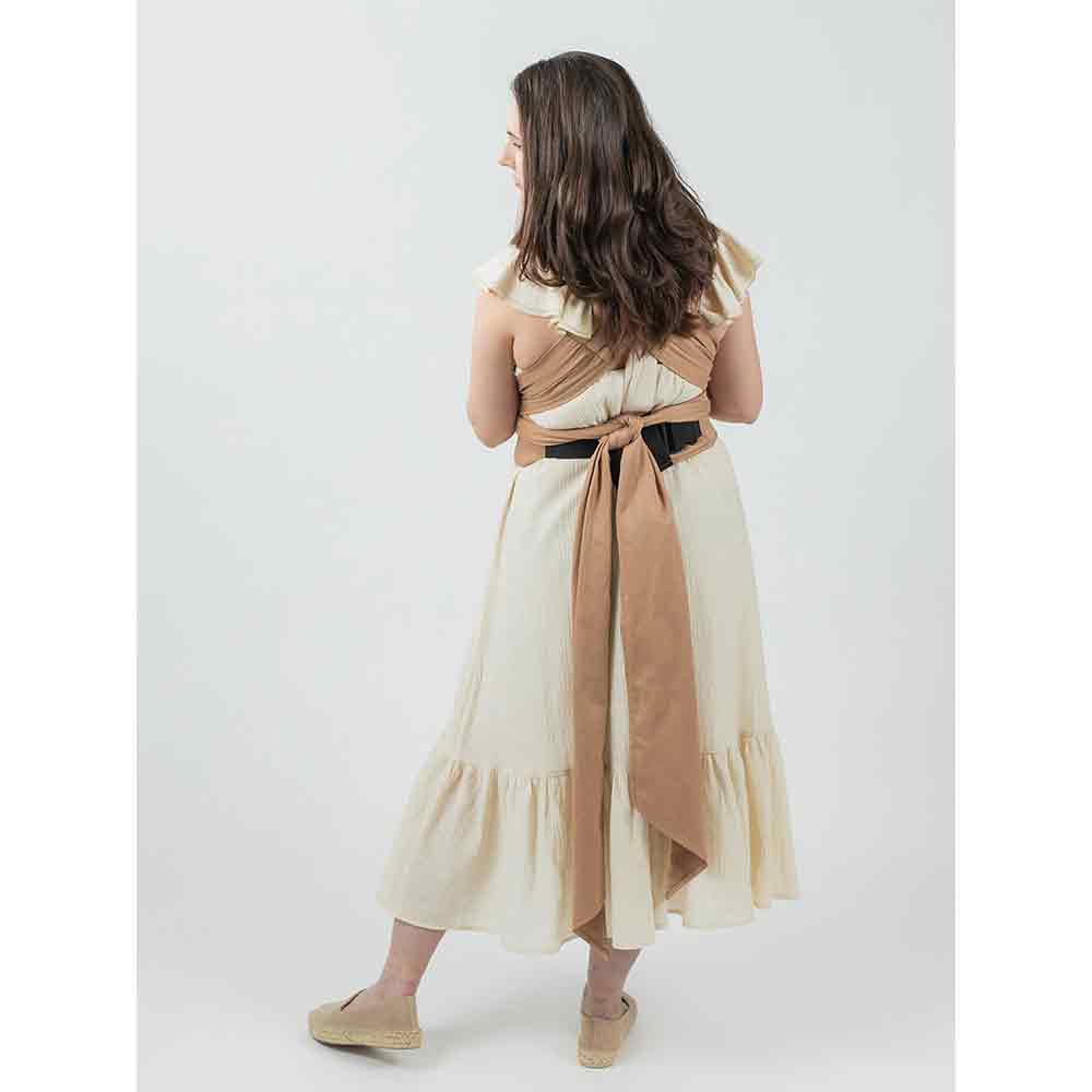 Die Schulterträger der Tragehilfe sind über Deinen Rücken gekreuzt. Das sorgt für eine gleichmäßige Gewichtsverteilung. Weiterhin kannst Du die breit auslaufenden Tuchbahnen der Schulterträger über den Po Deines Kindes auffächern, wenn Dein Kind größer und schwerer wird. Somit "trägt" die Tragehilfe mehr Gewicht Deines Kindes und entlastet Dich gleichzeitig.